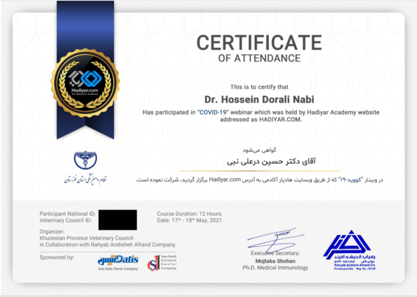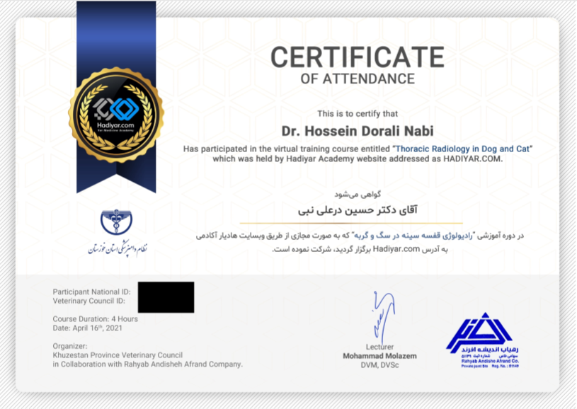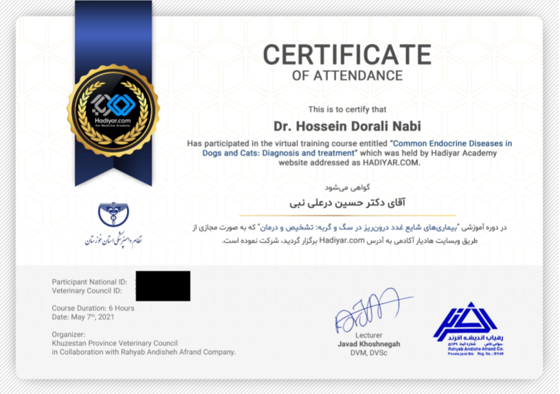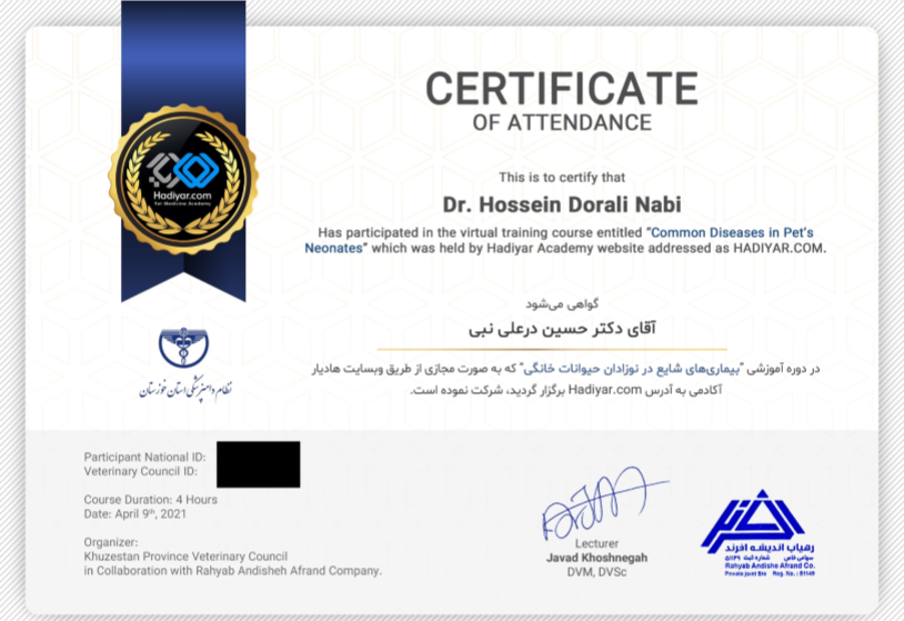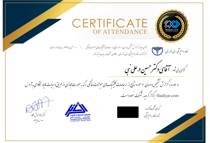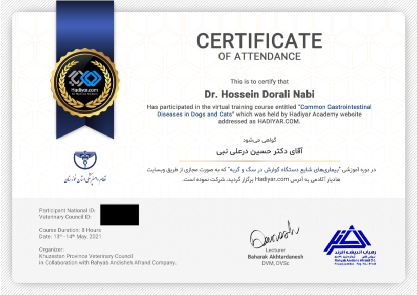 سلام، من حسین درعلی هستم تحصیلاتم را در رشته دامپزشکی و در دانشگاه شیراز (پهلوی سابق)گذراندم و موفق به کسب رتبه ممتاز از این دانشگاه شدم،درطول دوره تحصیل عمده تمرکزم را روی طب داخلی حیوانات خانگی گذاشتم و در اسفند ماه 1397 موفق به دفاع از پایان نامه خودم با کلیت نانو تکنولوژی در ترمیم زخم شدم. از سال 1398 تا خرداد ماه 1400 مشغول به فعالیت در زمینه داخلی حیوانات خانگی در شهر اهواز بودم و از سال 1400نیز مدیریت و بخش داخلی کلینیک اختصاصی حیوانات خانگی یونی پت را بر عهده دارم.